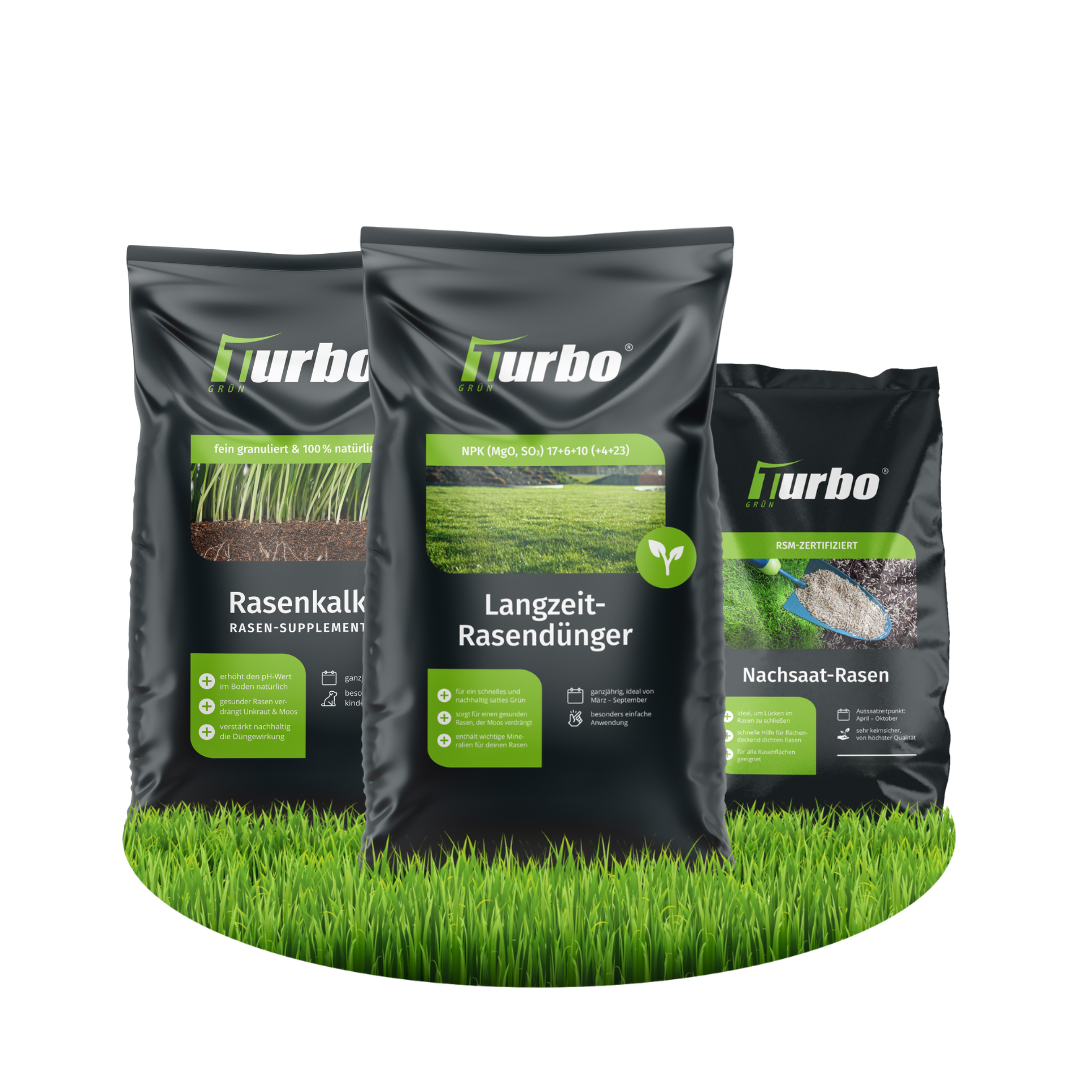 500m²: 1x 10 kg Langzeit-Rasendünger; 3x 1 kg Nachsaat; 3x 18 kg Rasenkalk